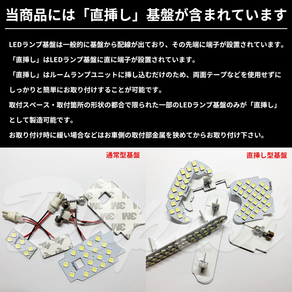 純正LEDルームランプ(電球の取り外しが出来ないタイプ)の場合はお取り付け出来ませんのでご注意ください。商品のセット内容とお車の室内灯をご確認下さい。取り付けの際はルームランプユニットにマスキングテープを貼るなど保護対策をお願いします。パーツのお取り付けは自己責任でお願いします。パーツを取り付けたことによる事故・不具合等の一切の保証は致しかねます。