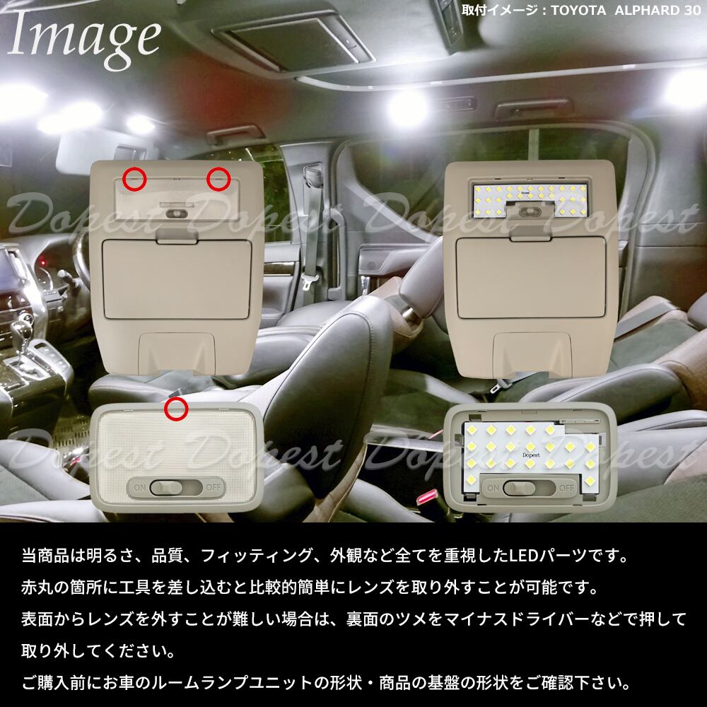 純正LEDルームランプ(電球の取り外しが出来ないタイプ)の場合はお取り付け出来ませんのでご注意ください。商品のセット内容とお車の室内灯をご確認下さい。取り付けの際はルームランプユニットにマスキングテープを貼るなど保護対策をお願いします。パーツのお取り付けは自己責任でお願いします。パーツを取り付けたことによる事故・不具合等の一切の保証は致しかねます。