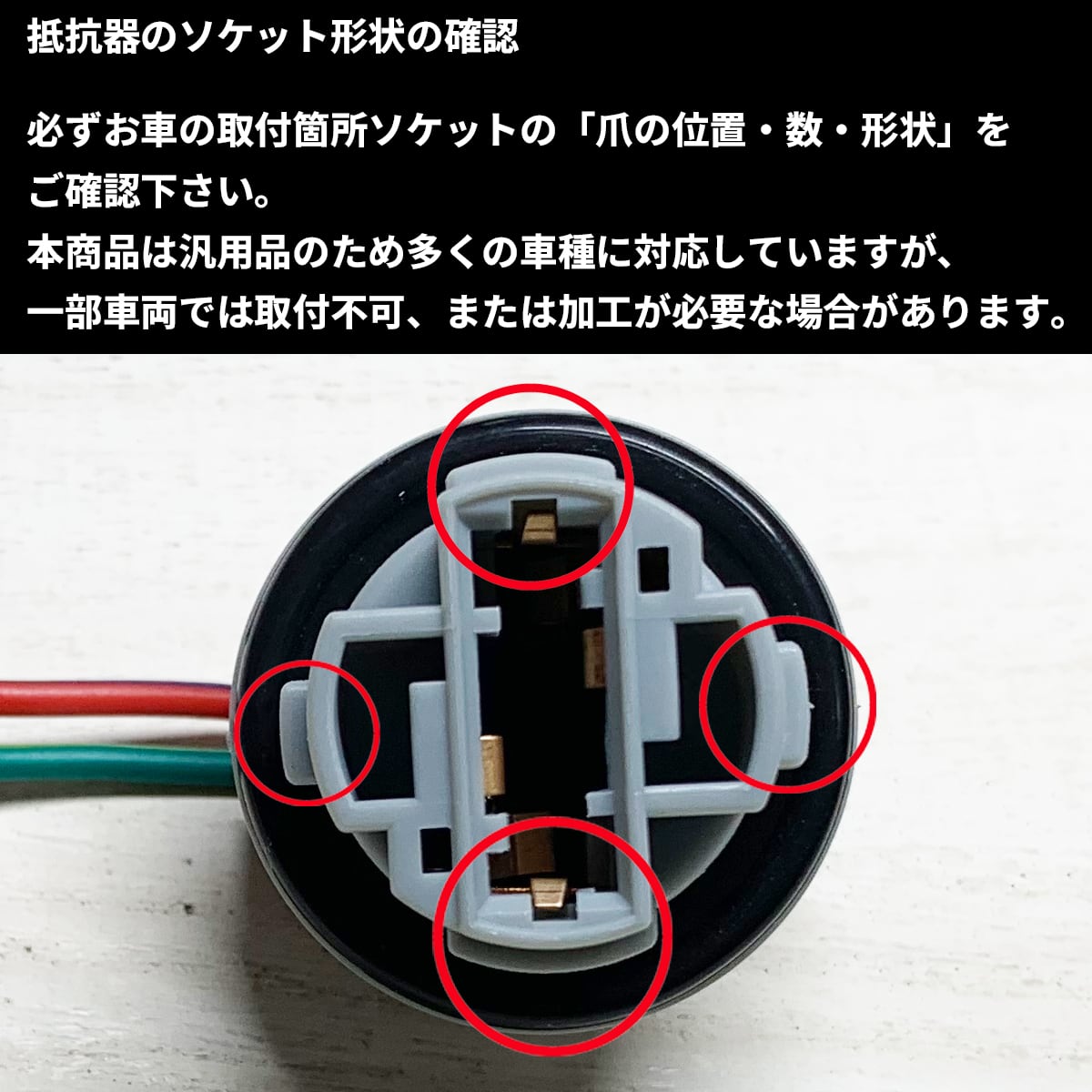ご購入前に必ず「ソケット形状・適合・取付スペース」をご確認下さい。本商品は左右用2個セットです。抵抗器のオス・メス端子はコーキング・防水未加工です。必要な場合は追加施工して下さい。取り付けに関するサポートは行っておりません。パーツのお取り付けは自己責任でお願いします。パーツを取り付けたことによる事故・不具合等の一切の保証は致しかねます。