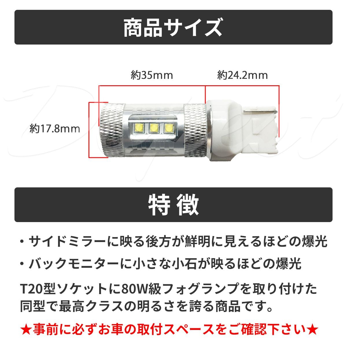 年式やグレード等により取付箇所の形状が異なる場合があるため、必ず「商品の適合・お車の取付スペース」をご確認下さい。純正LEDバックランプ仕様車の場合、お取り付け出来ない場合がございますのでご注意ください。縦サイズは純正球と比較し約18mmほど長くなります。パーツのお取り付けは自己責任でお願いします。パーツを取り付けたことによる事故・不具合等の一切の保証は致しかねます。