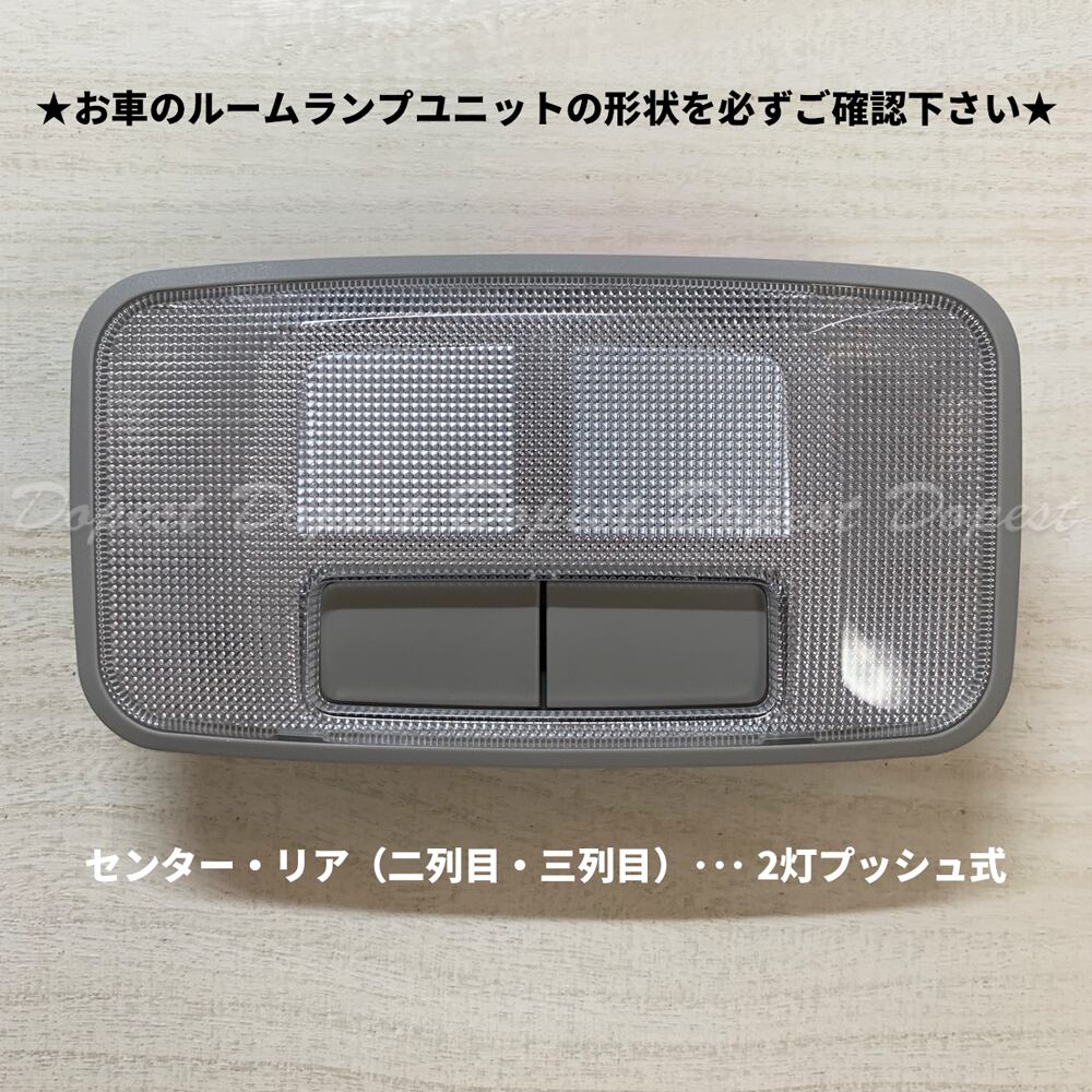 【必ずお車のセンター・リアのランプがそれぞれ2灯式であることをご確認下さい】純正LEDルームランプ(電球の取り外しが出来ないタイプ)の場合はお取り付け出来ませんのでご注意ください。取り付けの際はルームランプユニットにマスキングテープを貼るなど保護対策をお願いします。パーツのお取り付けは自己責任でお願いします。パーツを取り付けたことによる事故・不具合等の一切の保証は致しかねます。