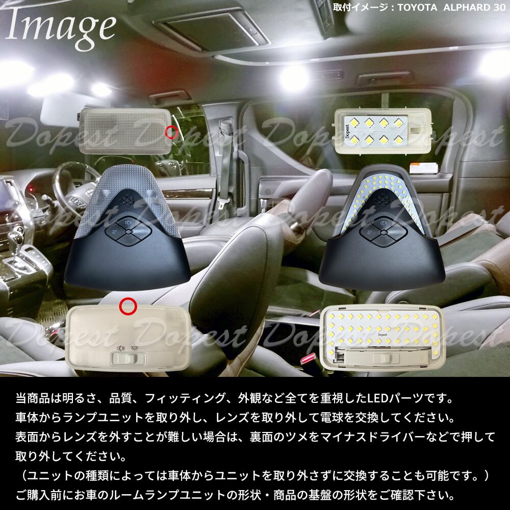 純正LEDルームランプ(電球の取り外しが出来ないタイプ)の場合はお取り付け出来ませんのでご注意ください。商品のセット内容とお車の室内灯をご確認下さい。取り付けの際はルームランプユニットにマスキングテープを貼るなど保護対策をお願いします。パーツのお取り付けは自己責任でお願いします。パーツを取り付けたことによる事故・不具合等の一切の保証は致しかねます。