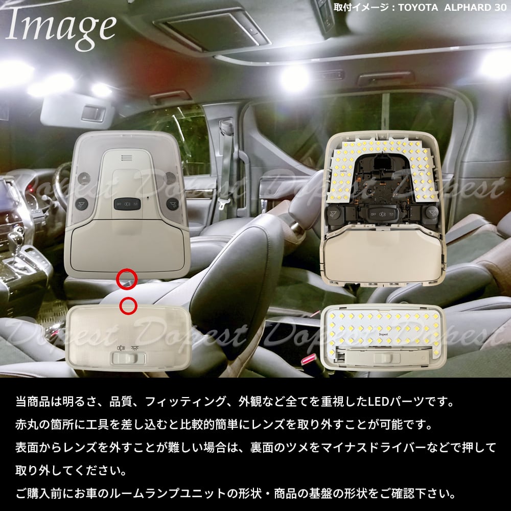 純正LEDルームランプ(電球の取り外しが出来ないタイプ)の場合はお取り付け出来ませんのでご注意ください。商品のセット内容とお車の室内灯をご確認下さい。取り付けの際はルームランプユニットにマスキングテープを貼るなど保護対策をお願いします。パーツのお取り付けは自己責任でお願いします。パーツを取り付けたことによる事故・不具合等の一切の保証は致しかねます。